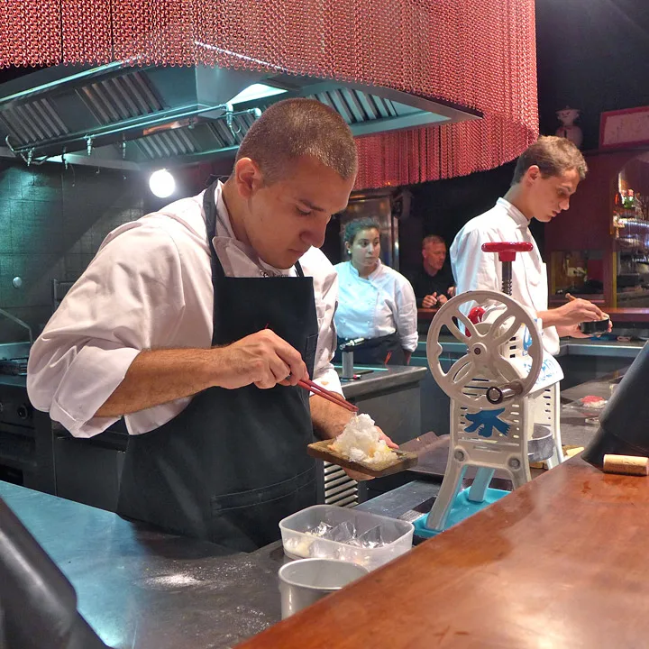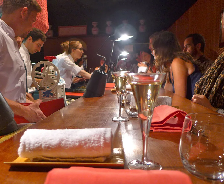 Vi setter oss ved en «bardisk» og kan se kokkene jobbe foran oss. Rundt oss er det gjester som ser ekstatiske ut, noen ser litt provoserte og sinte ut, noen er avventende og skeptiske og andre er blide og fornøyde. Maten setter tydeligvis sving på sinnsstemningene hos folk.