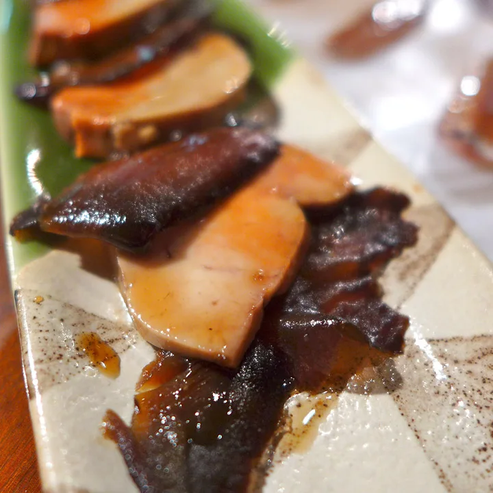 Neste rett er krevende som fy. Breiflabblever og shitakesopp og sardiner penslet med ansjossaft. Jeg likte forsåvidt leveren, men resten var for mye fiskesmak.