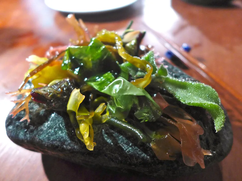 Så kom vi til retten Erik og Kamilla (mannen min og venninne) syntes var den aller verste: Ørten sorter tang med saltvann og noen skjell eller snegler som så ut som aliens. Jeg digget skjellene, men er vel enig om at det ble vel mye tang og sjøvann. På den annen side er det jo spennende å smake forskjellige typer tang. Noen er myke i konsistensen. Andre er krisp. Dette er supersunn mat som vi sikkert må regne med å spise mer av i fremtiden. Vakker rett var det.