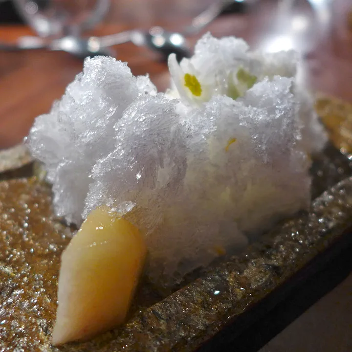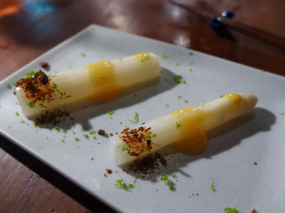 Neste rett er mer normal. Dette var hvit asparges servert på to måter med miso og appelsinblomster.