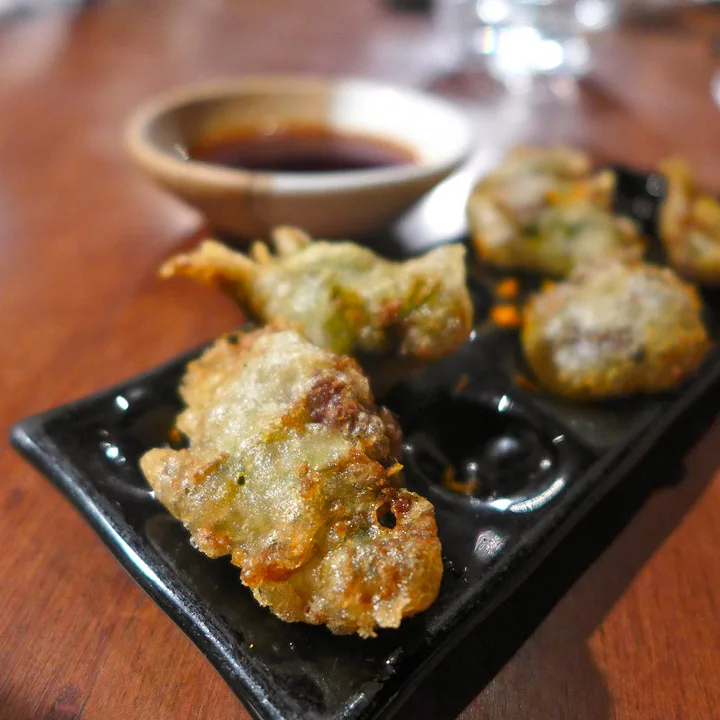 Sjøanemone-tempura? Hæ? Ja da. Det ble neste rett. Sjøanemone er en havblomst og den fungerte helt fantastisk som tempura. Konsistensen var deilig og sprø utenpå og silkemyk i midten. Minner litt om friterte squashblomster, faktisk.
