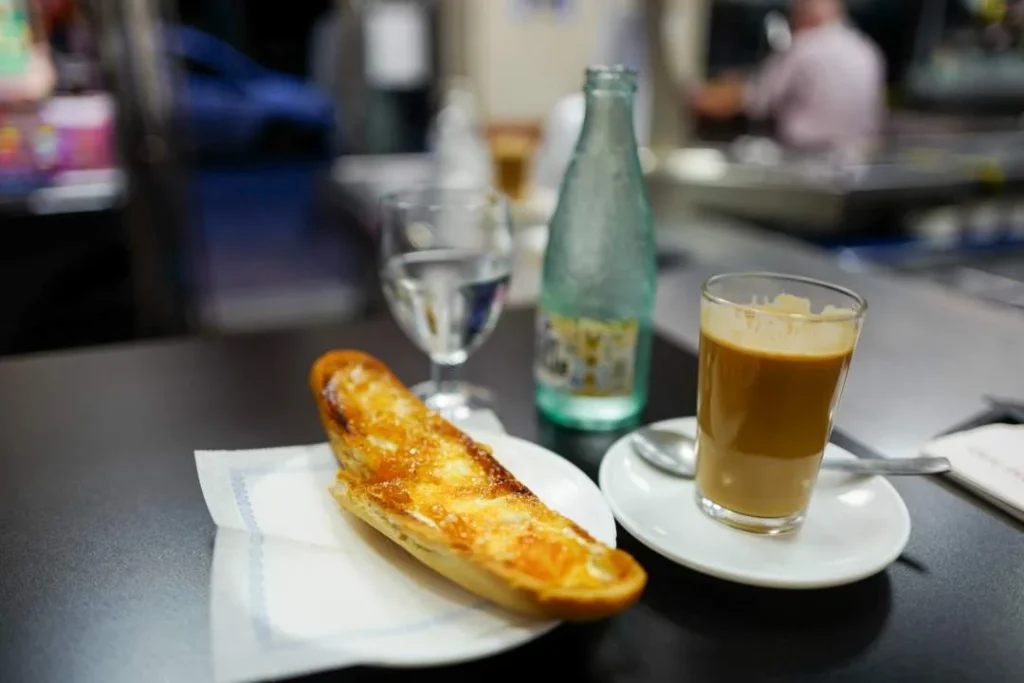 Min frokost ble media tostada med smør og ferskenmarmelade, vann med bobler og en cafe con leche.