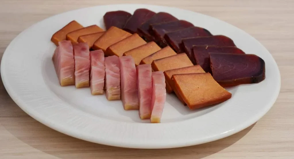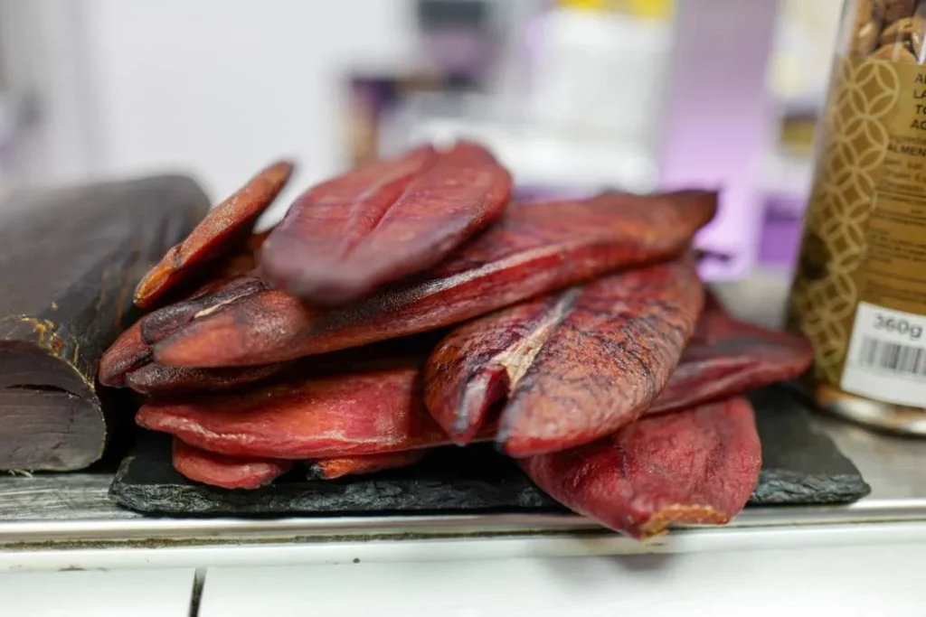 Du kan også kjøpe Mojama, en type salazon (fellesbetegnelsen for salt-tørket fisk) og den mest eksklusive. Laget av ryggen på tunfisken. Saltet i to dager. Så vaskes den og tørkes i to-tre uker. serveres gjerne med salte og ristede mandler og øl.