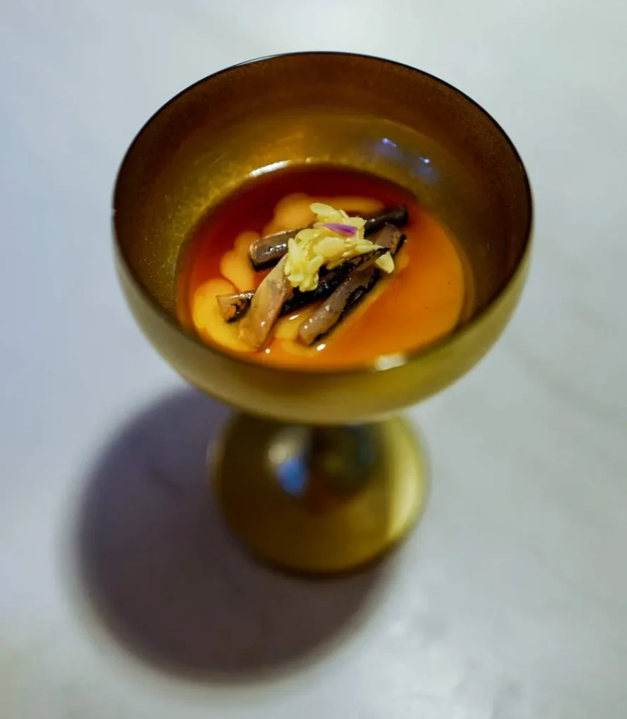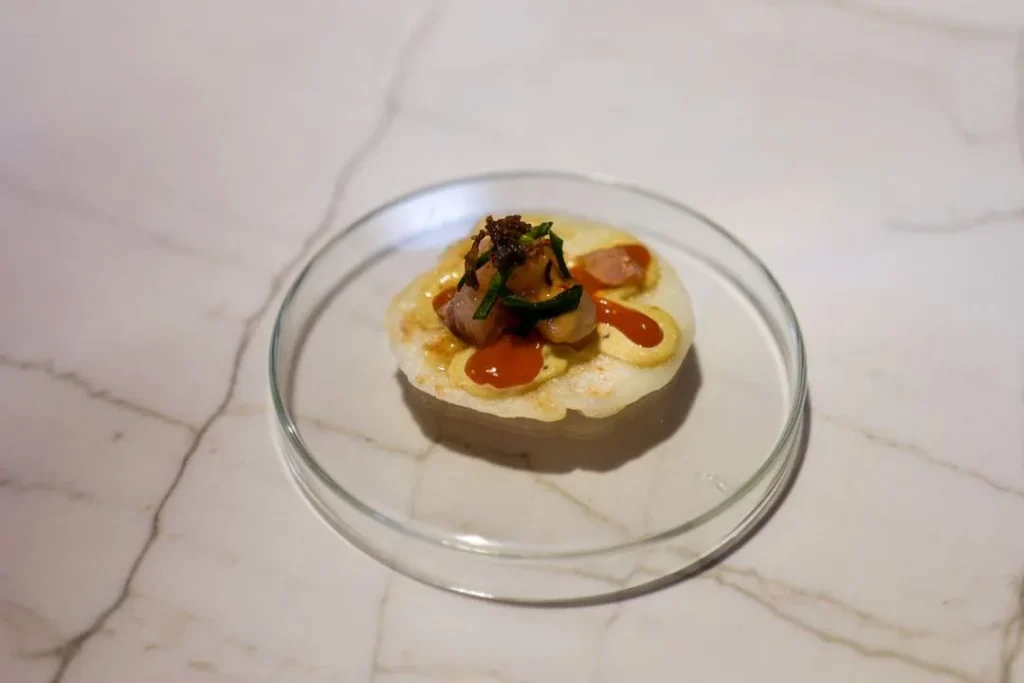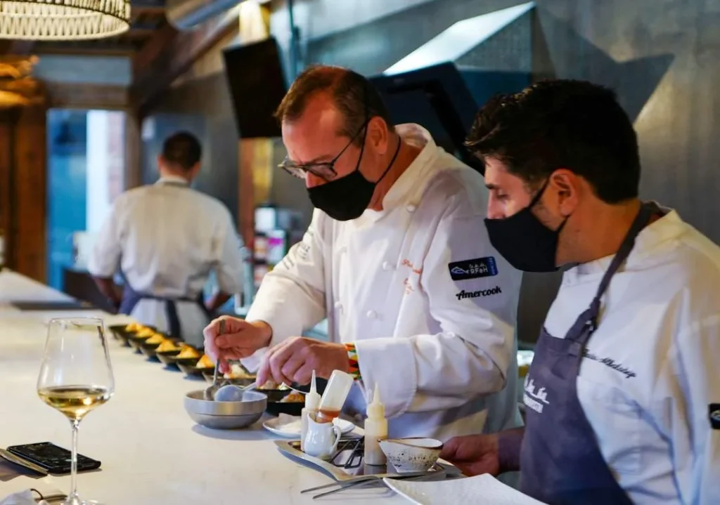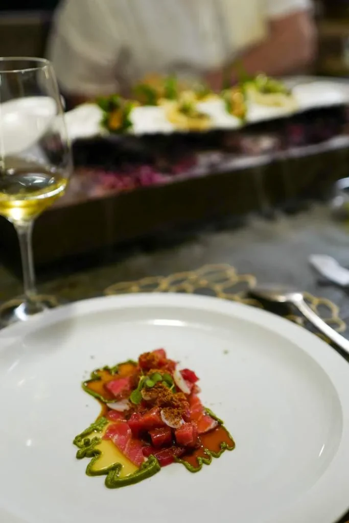Pablo González-Conejero driver Restaurante Cabaña Buenavista som har to michelinstjerner. Restauranten ligger en liten kjøretur utenfor Murcia i en idyllisk park. Jeg elsket hele opplevelsen fra demonstrasjonen vi fikk sammen med Pablo i Laboratorio de I+D+i (som jeg tror ikke er åpent for alle, men som bruks som et testkjøkken) til smårettene vi fikk på terrassen før selve måltidet inne i restauranten som minnet meg om stråtak-restauranter jeg har spist på i Afrika. Maten er gourmet, men betjeningen er avslappet, men korrekt og med et glimt i øyet.