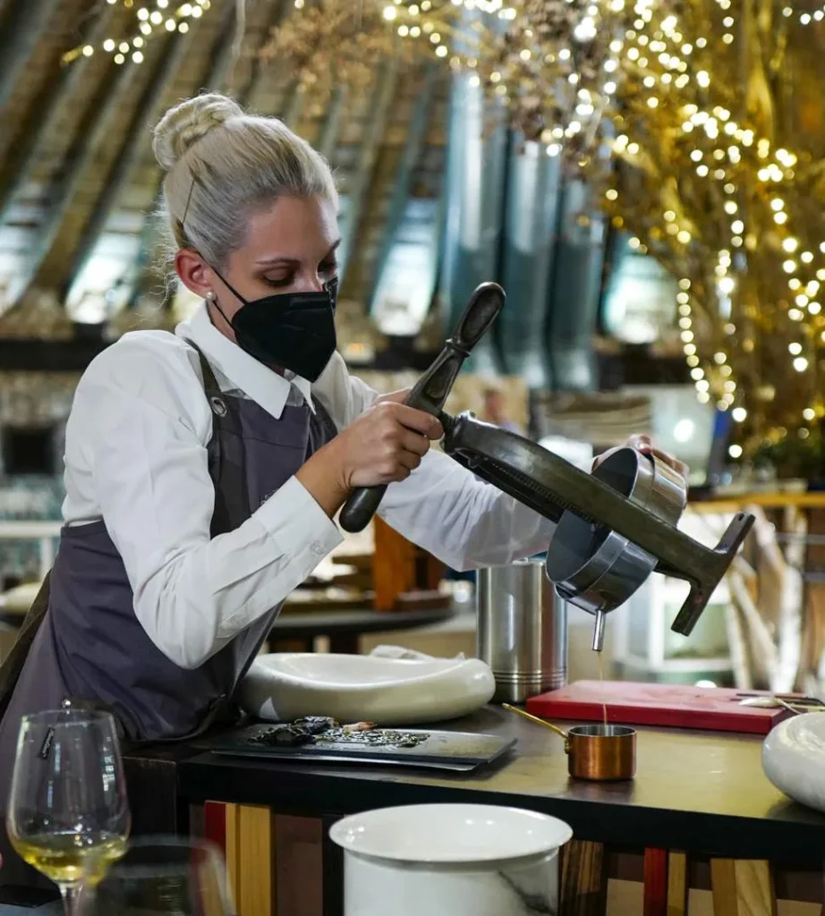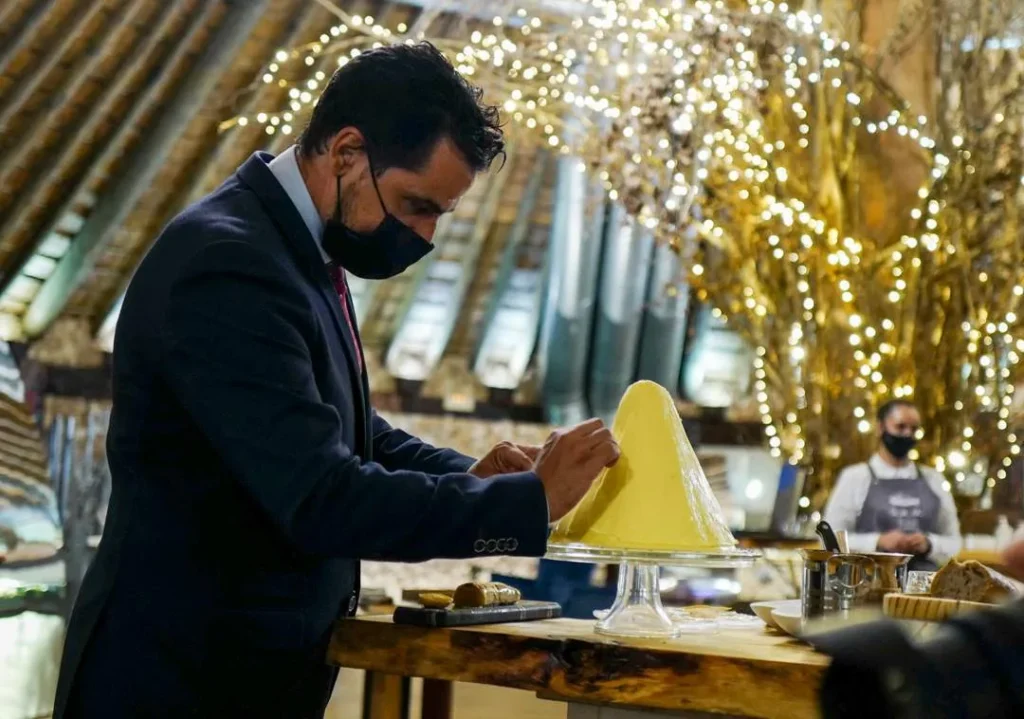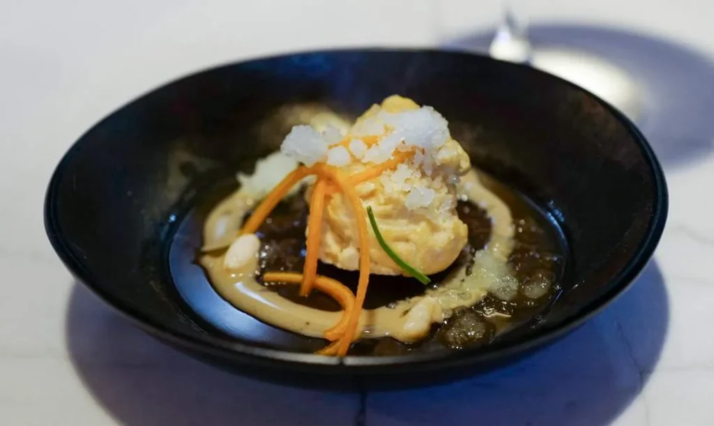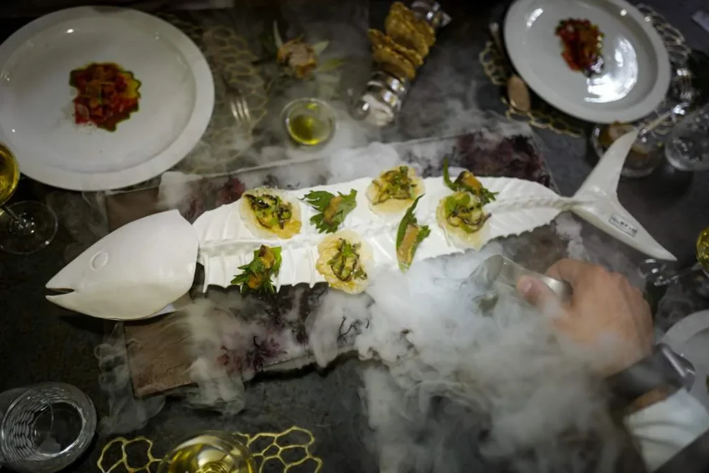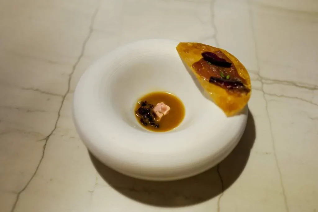 Noen høydepunkter å nevne er brød og smør-serveringen, ferskosten som lages ved bordet, ostevognen som ser ut som noe som har landet på månen, petit four-serveringen og ikke minst tunfisk-serveringen.