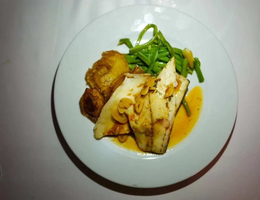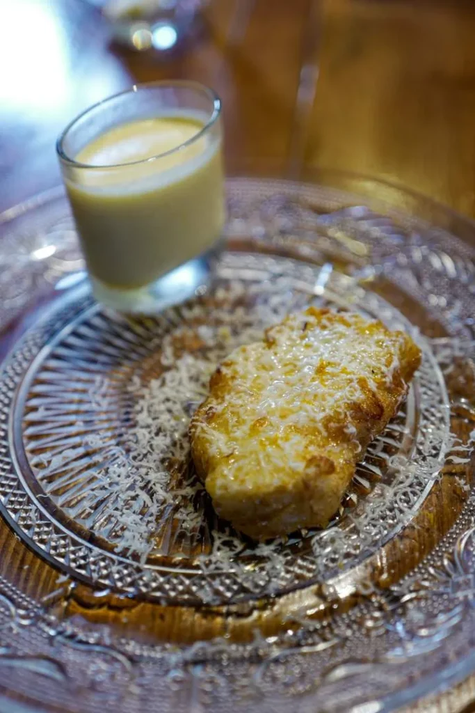 Til dessert fikk vi servert en variant av påskedesserten Torrijas som er en slags arme riddere med sitroniskerm og hvit sjokolade.
