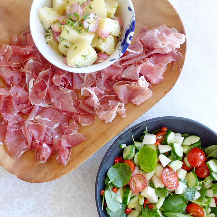 Det er sommer og vi liker å gjøre ting litt enkelt: En kottis på grillen, litt spekemat på fjøla. Det er slik det skal være. Gode og enkle smaker. Jeg har en salat som jeg synes er veldig god til spekemat. Den inneholder melon og det passer kjempebra til saltmat. Dessuten kjøpte jeg en urtepotte på butikken forleden dag, og det var brønnkarse i den. Det har jeg aldri kjøpt før, bare smakt på restaurant. Den smaker kraftig, litt som vanlig karse som man gror selv på bomull. Den passet superbra i den enkle salaten min.