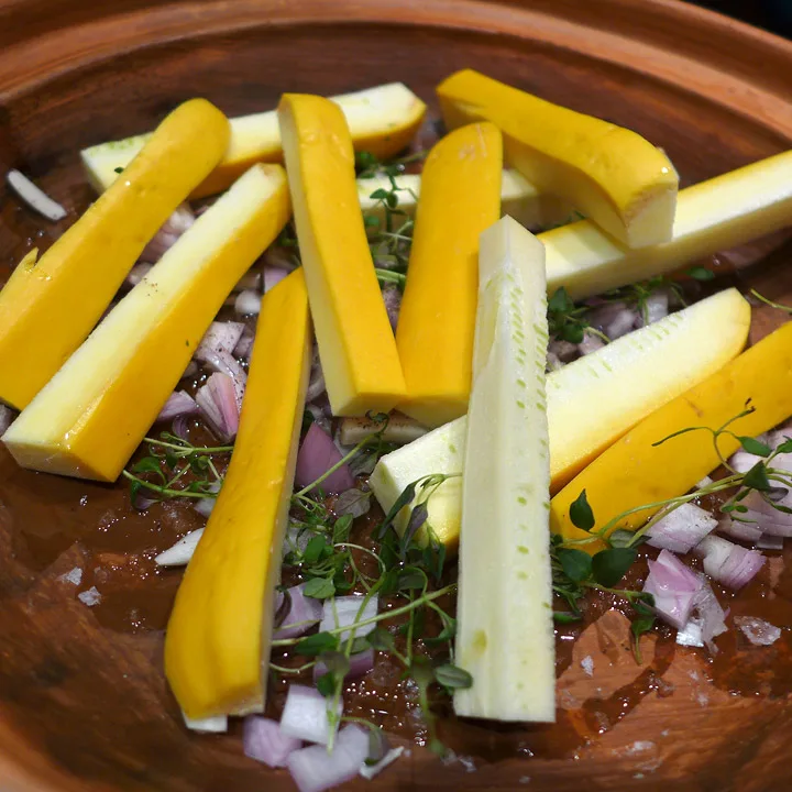 1 gul squash (bruk helst gul, men finner du det ikke kan du bruke en grønn), skjær på langs i 10-12 strimler