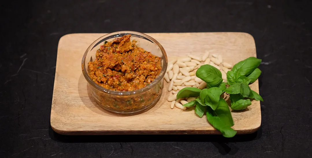 Jeg elsker en enkel middag med pasta og pesto, men pestoen trenger ikke være grønn. Har du noen gang smakt rød pesto? Det er så godt og så enkelt å lage. Jeg er i utgangspunktet ikke spesielt glad i soltørkede tomater, men brukt riktig, er det noe av det beste!
