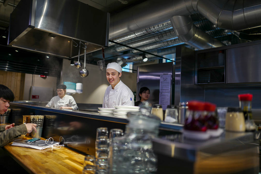 Jeg møter Christian Inage, sønnen til sjefen, Masaru Inage. Christian, som er halvt japansk og dansk står bak grytene og serverer rykende varme boller med kraft og nudler.