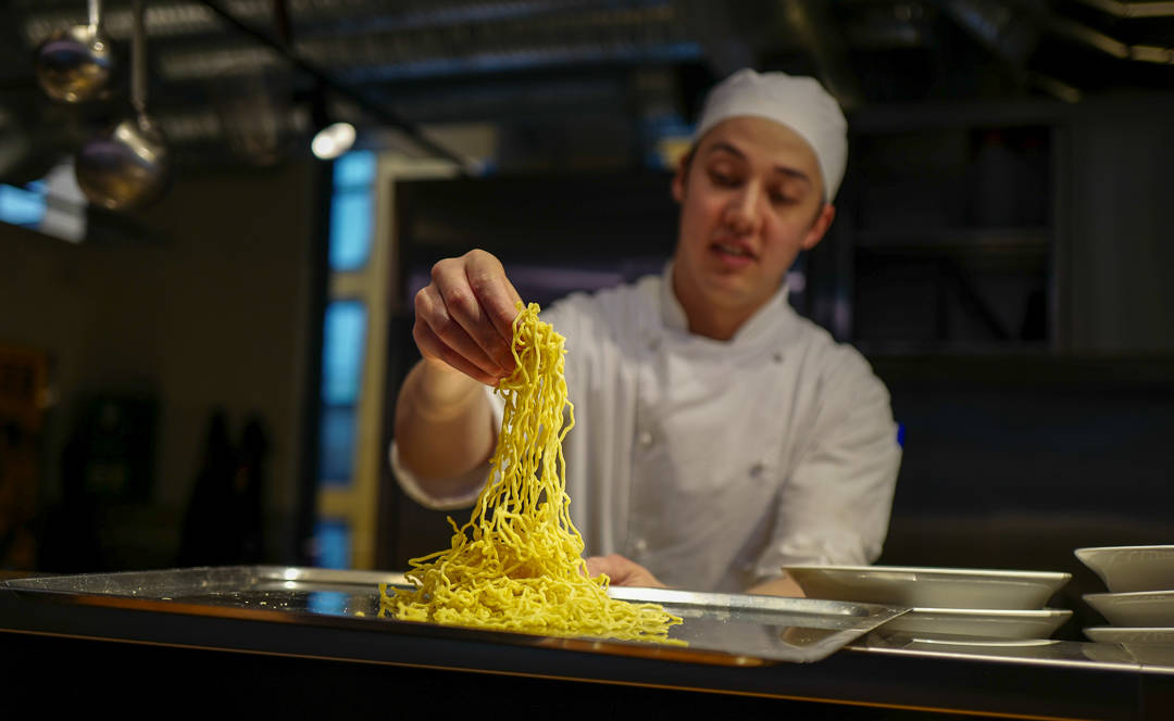 – Her på Sapporo lager vi ramen inspirert av Nord-Japan. I sør har de soba-nudler. De går lett i oppløsning i varm kraft. I nord bruker vi egg i nudlene. Måten vi bretter deigen på er helt unik. Den brettes 7 ganger, så legges den i kjøleskapet en stund. Dette gjøres hele 7 ganger. Nudlene får mer tyggemotstand da, forklarer Christian Inage.