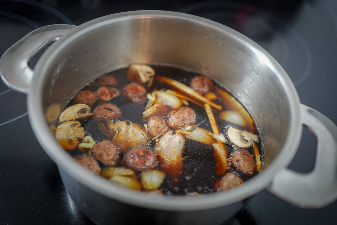 Tilsett soyasaus, sopp, ingefær, løk og hvitløk. La dette koke opp og demp så temperaturen til medium. Kraften skal trekke i en halvtimes tid. Smak til med mer soya,. Sil av.