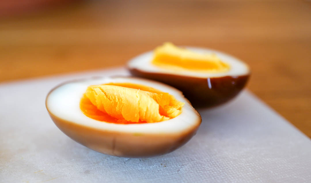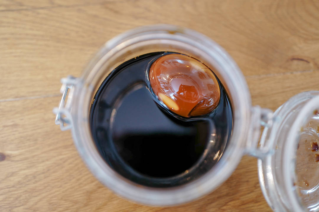 Eggene: Start med å koke eggene i 10 minutter. Kjøl ned og skrell. Legg eggene i en pose med soyasaus, sukker, mirin og vann. Legg kjølig i minimum fire timer.