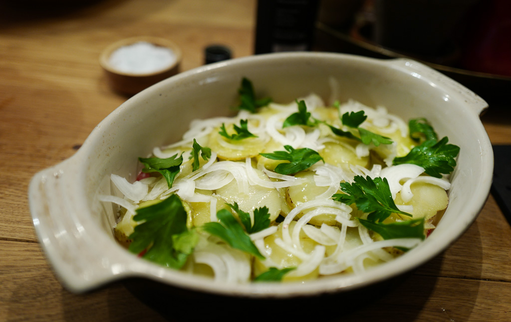 Hell på 3-4 ss extra virgin olivenolje i formen. Legg tomatskiver i formen sammen noen persilleblader. Legg potetskiver og løkskiver i formen. Salt og pepre litt og ha enda mer olivenolje over retten.