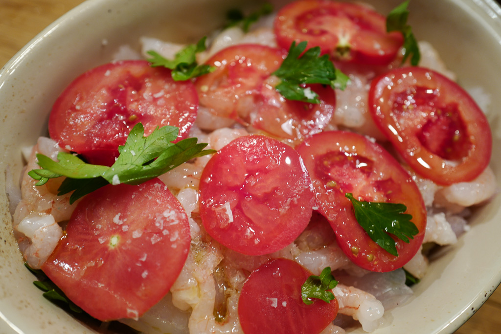 Legg på fisk og reker samt et nytt lag med tomater og persille. Salt og pepre og hell et par spiseskjeer med olivenolje over. Sett i ovnen i ca 20 minutter.