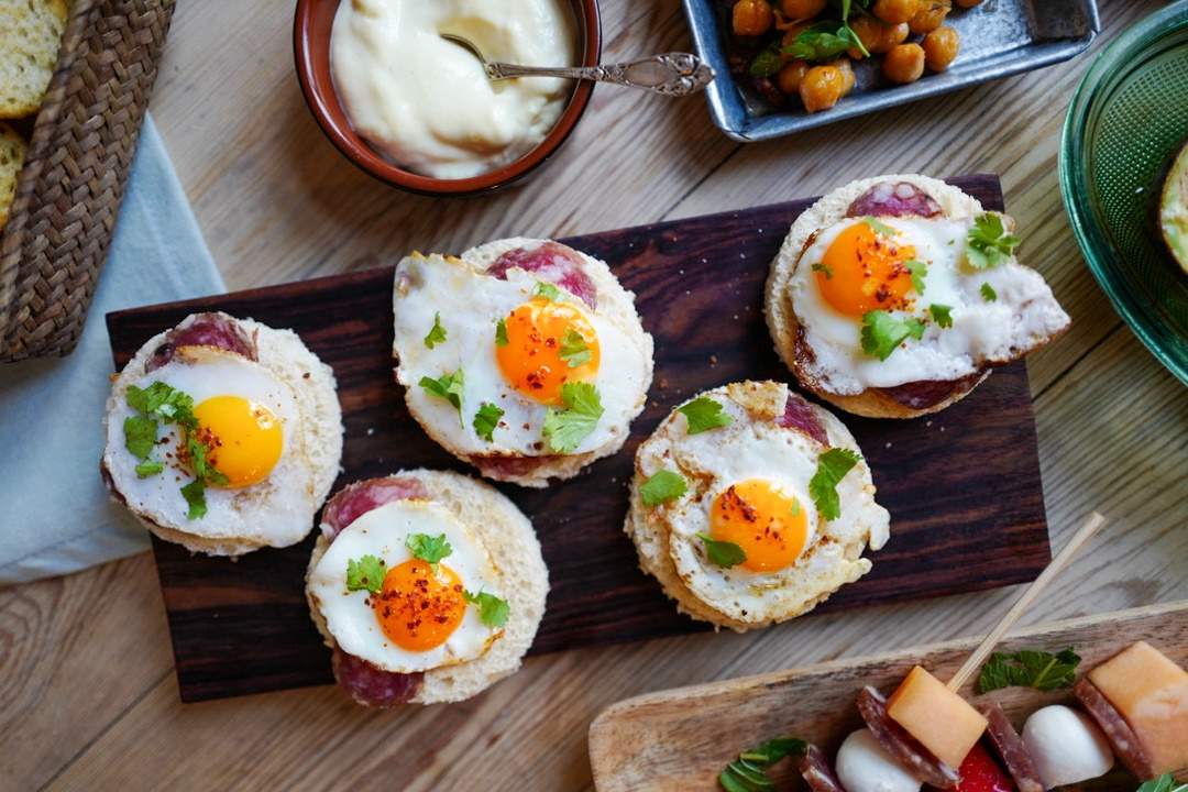 Dette er en fin måte å bruke opp gammelt grød på. Bruk en utstikkerform eller peppekakeform og stikk ut sirkler av ristet brød. Smør på litt hvitløksmajones, smør eller kanskje litt sennep på skivene og legg skiver av salami på brødet. Jeg brukte trøffelsalamien, Jåla som Ask gård lager. Den er bare helt rå! Den må du prøve hvis du har sansen for det lille ekstra. Og det lille ekstra må man unne seg av og til. Derfor har jeg stekt speilegg av vaktelegg og lagt på toastene. Dryss gjerne litt rosépepper over samt et par dråper god olivenolje og hakket persille.