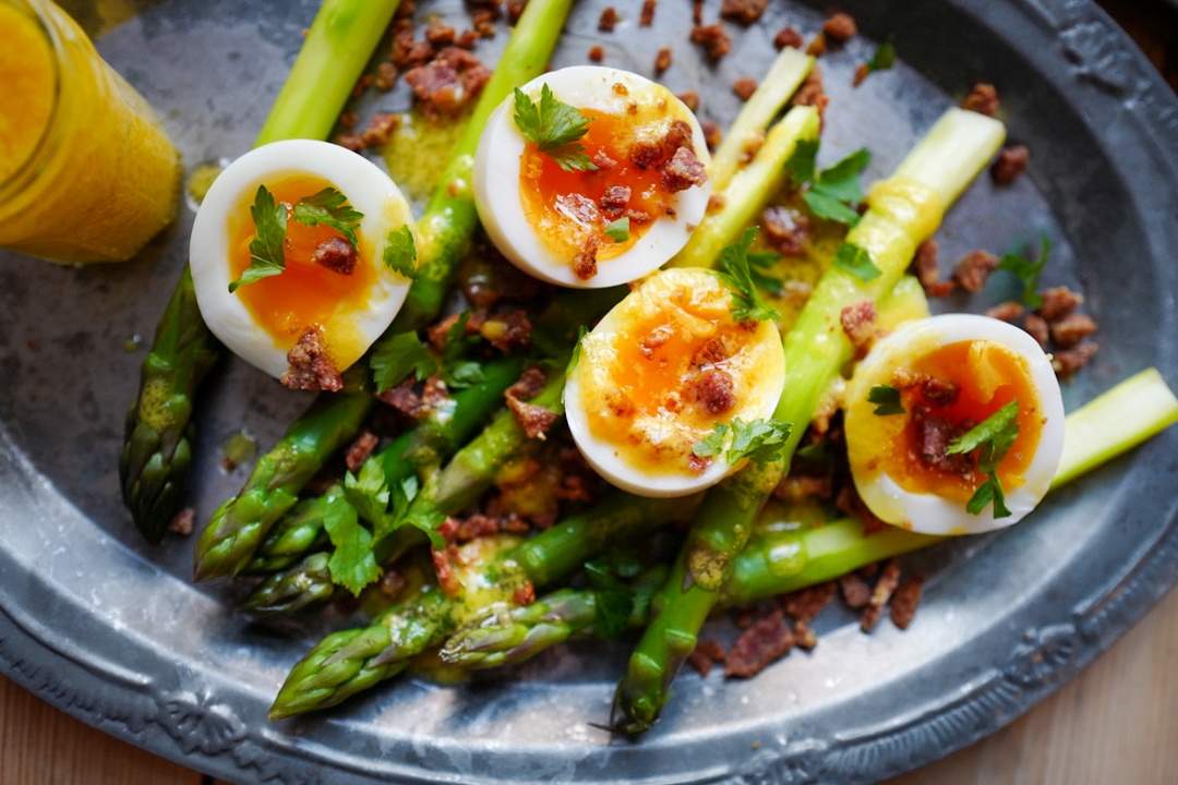 Asparges med salamikrøsnj, smilende egg og smørsaus