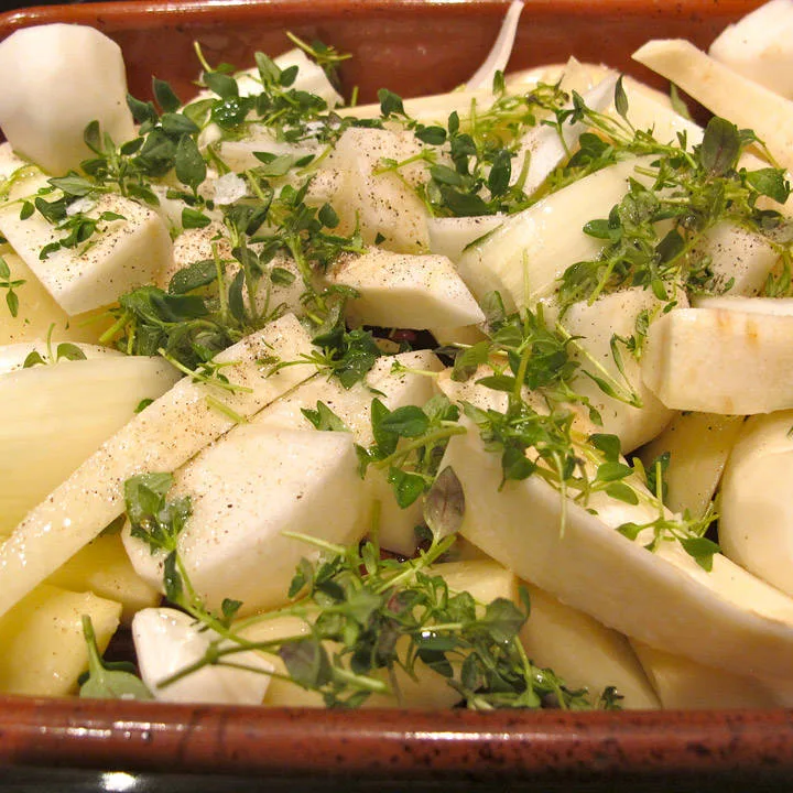 Smør en ildfast form med vanlig olivenolje. Hell rotfruktene oppi og strø salt, pepper og timian over. Hell et par ss ollivenolje over og bland godt. Sett formen i ovnen (som du har forvarmet på 160 grader). La formen stå i ovnen en time- halvannen til rotfruktene er myke og lett gylne.