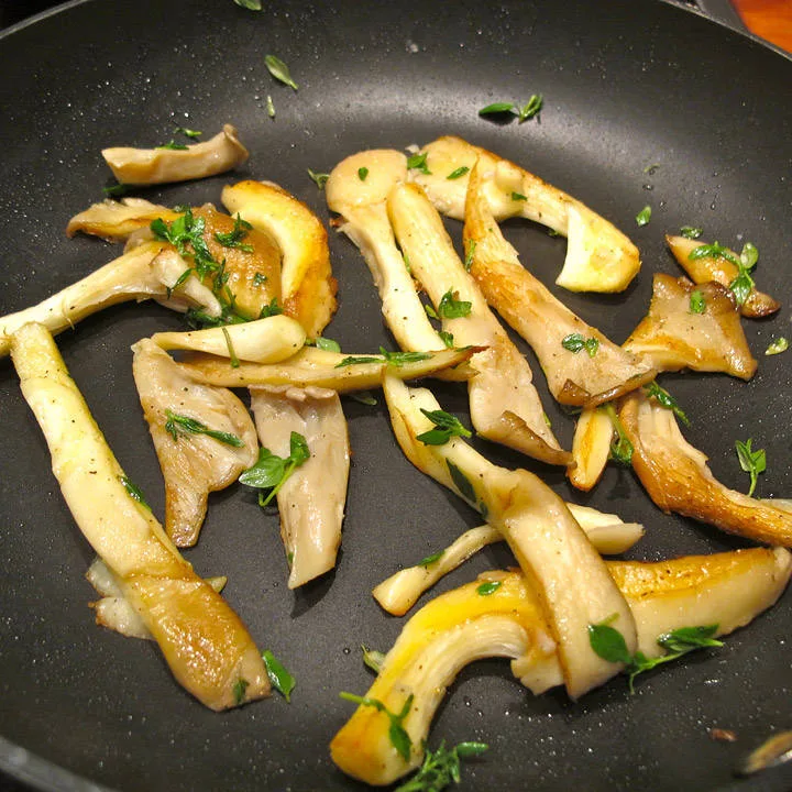 Østerssopp stekes i smør. Salt og pepre. Når soppen er lett gyllen tilsetter du hakket timian og noen dråper sitronsaft. Helt til slutt river du litt sitronskall over. Det smaker himmelsk!