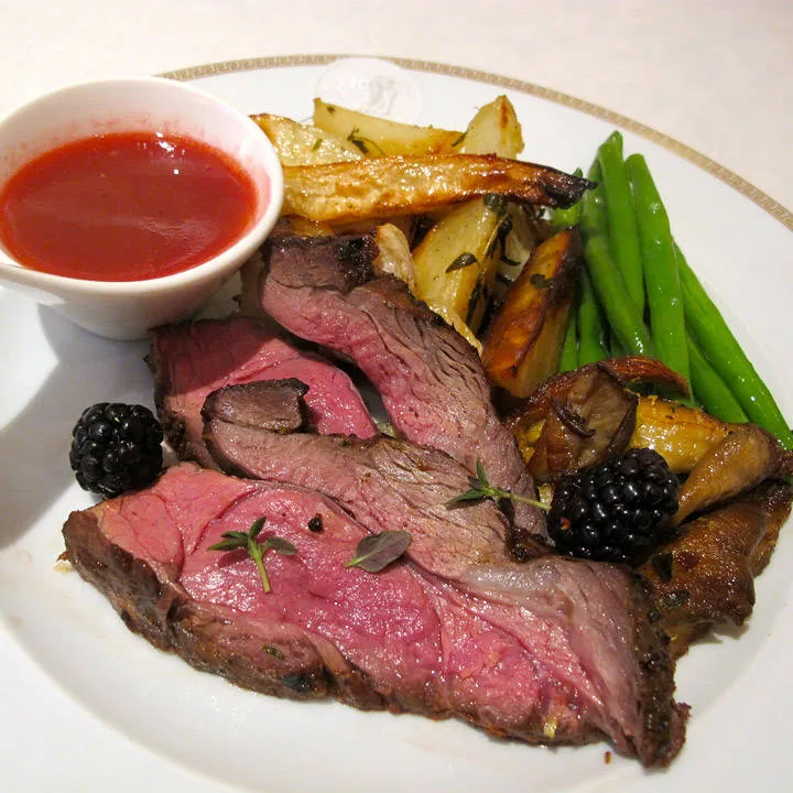 Valget av tilbehøret ble: bærsaus i form av bjørnebær, ovnsbakte, hvite rotfrukter, smørdampede aspargesbønner, pannestekt østerssopp og en herlig flaske Bordeaux. Plutselig var det ikke så farlig at regnet pøste ned. Innendørs var det stor stemning, kos og herlig mat.