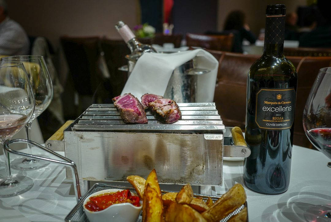 Så kommer kjøttet inn – og en egen grill. Slikt har jeg aldri sett før. Kjøttstykket er skåret i tykke skiver og det er nå meningen at man skal grille ferdig sine egne kjøttstykker slik man liker dem. Det er megastore lftekanaler i denne restauranten og det må det være for på hvert bord sitter folk å griller kjøtt.