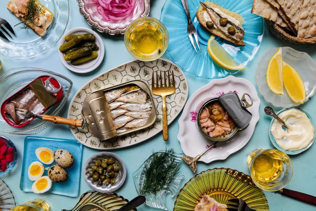 På mitt bord har jeg brukt Sardiner i extra virgin olivenolje, kippers, yellowfin tunfisk i olivenolje og ansjosfilet.
