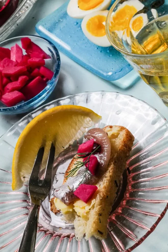 Som tilbehør har jeg satt frem knekkebrød, ristet focaccia, smør, majones, kapers, cornichons (små franske sylteagurker), sitron, dill, vaktelegg, syltet rødløk, rødbetesyltet knutekål. Du trenger selvsagt ikke sette frem alt dette, men det er for å gi deg noen idéer om hva som går an. Smør og majones gjør fisken saftigere og mildner smaken. Brød eller knekkebrød er et fint verktøy for å bære fiskeproduktene og dessuten gir det knas. Kapers, cornichons, syltet løk og rødbetesyltet knutekål gir syre og konsistens til fisken og sitron gir friskhet. Dill passer til fisk, så dermed basta.
