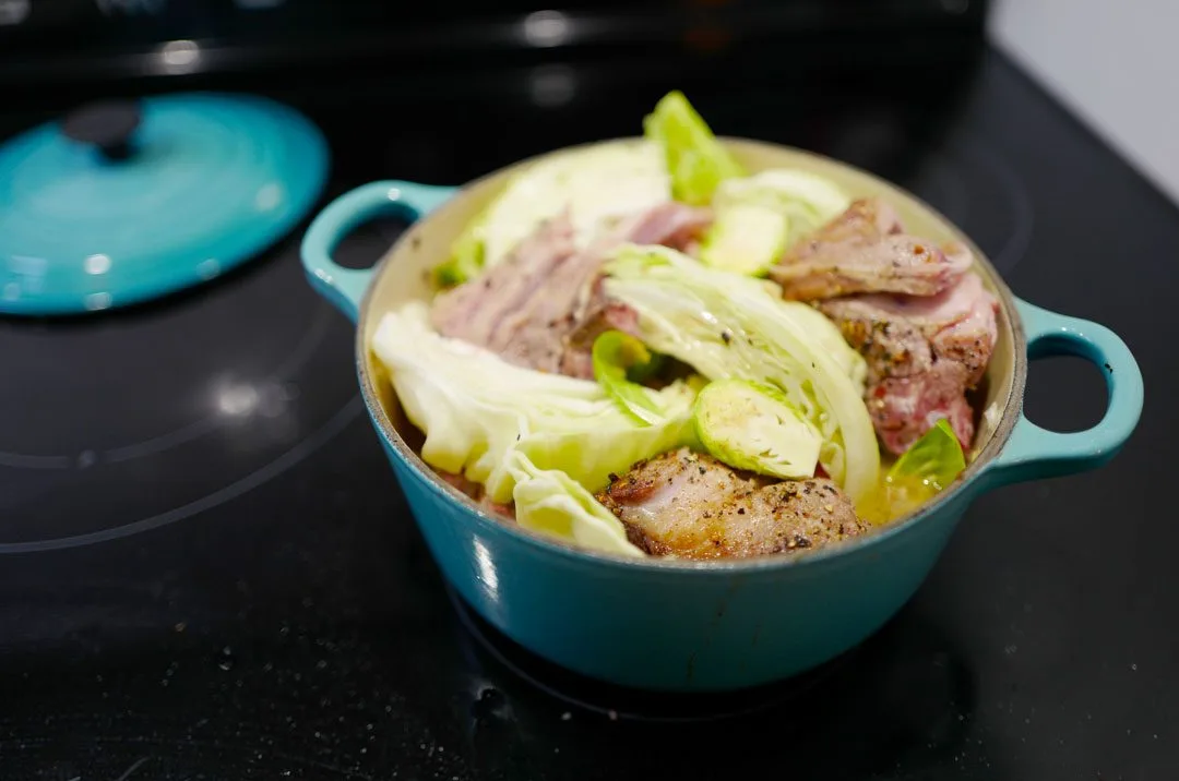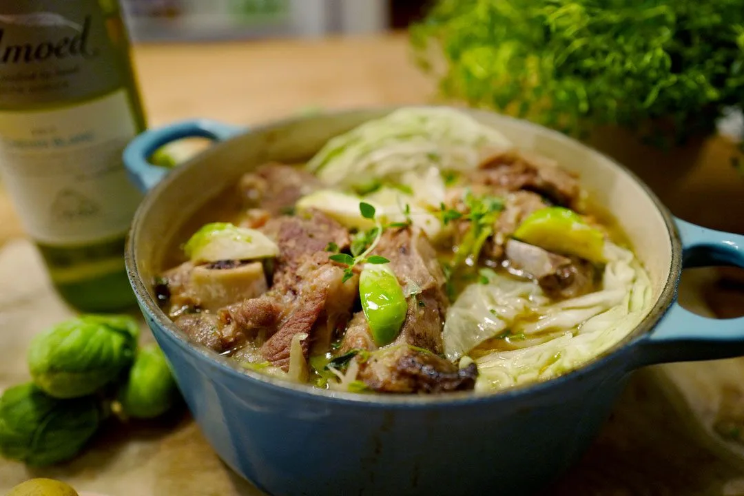 Legg så en ny porsjon kål i gryten. Spar siste tredjedel til slutt. Sett på lokk og småkok til kjøttet begynner å falle av beinet.