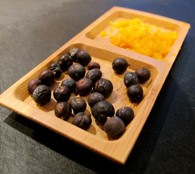 | Du kan ikke lage viltsaus uten å ha med litt av skogen inn i sausen. Derfor knuser jeg mange eienbær som jeg tilsetter. Det mer eksotiske og friske innslag av appelsin er mer utradisjonelt, men liver opp en ellers tung rett. |
