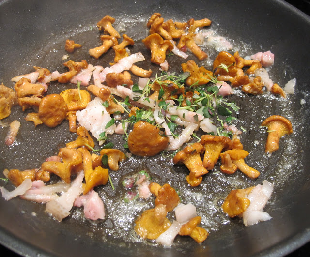 | Kantareller hadde jeg i fryseren fra i høst. Stek dem i panne sammen smør, bacon, timian og små pæreterninger. (bruk en fast pære som ikke går i oppløsning). Salt og pepre og dryss revet appelsinskall over til slutt. Sett til side og varm opp rett før servering. |