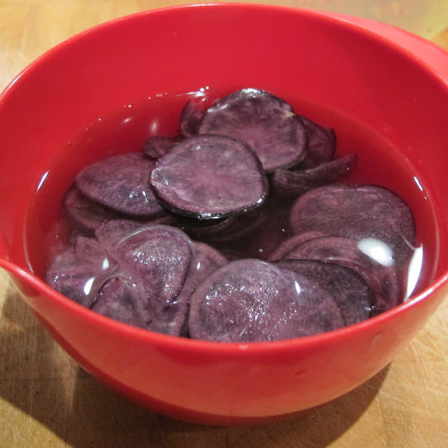 tynt med en mandolin eller potetskreller (eller siden på et rivjern). Legg dem i kaldt vann en stund, så tørker du dem av og slipper dem i varm, nøytral olje til de er lette og sprø. Ha dem over på et stykke kjøkkenpapir for å dryppe av fett, alte og pepre. Det samme gjør du med pastinakk og persillerot. |
