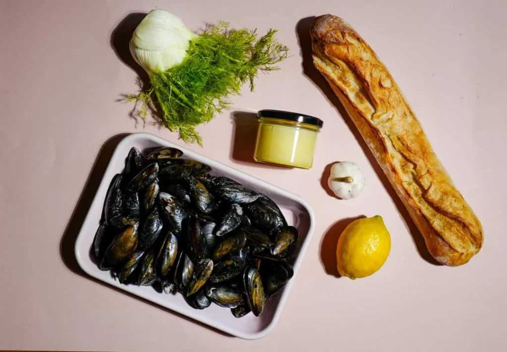 Start med å dampe blåskjellene i en kjele med 2 dl vann (gjerne med 50/50 tørr hvitvin). Damp blåskjellene til de akkurat åpner seg.