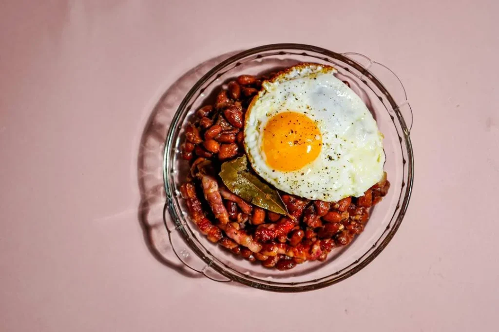 Start med å bløtlegge bønnene i vann over natten. Sett kjølig. Hell av vannet. Fres løk og hvitløk i ghee til det blir mykt. Tilsett vin og la alkoholen dampe bort noen minutter. Hell på kraft og bønner. Tilsett krydder og sett på lokket. La småkoke i 30 min. Stek baconterninger på medium varme for å få ut mest mulig fett. Når terningene er gylne heller du dem og fettet over i bønnegryten. Smak til med salt og pepper. Stek et egg eller to (i ghee) og legg på toppen av gryten ved servering. Godt med surdeigsbaguette til.