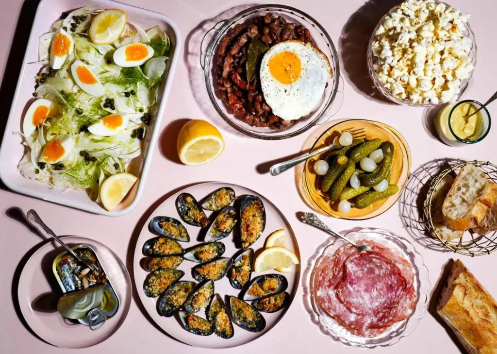 Legg spekemat på et fat eller en fjøl. Sylteagurker og løk i en skål, sennep i et glass og brød i en kurv. Da blir det en fin kveld.