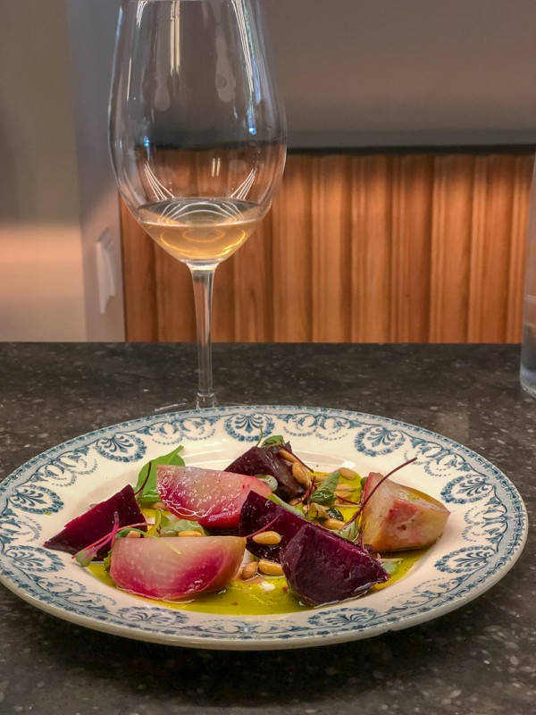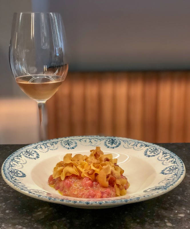 Maten er ufattelig god. Nå hadde jeg en rett som besto av karamellisert aubergin og poppet bokhvete. Den var til å besvime over. Det samme var kalvetartaren som var rørt med olivenolje og sitron. Vinutvalget er også fabelaktig. Dette er et sted man definitivt går for å spise i kombo med å drikke god vin. Bra utvalg på glass og flaske.