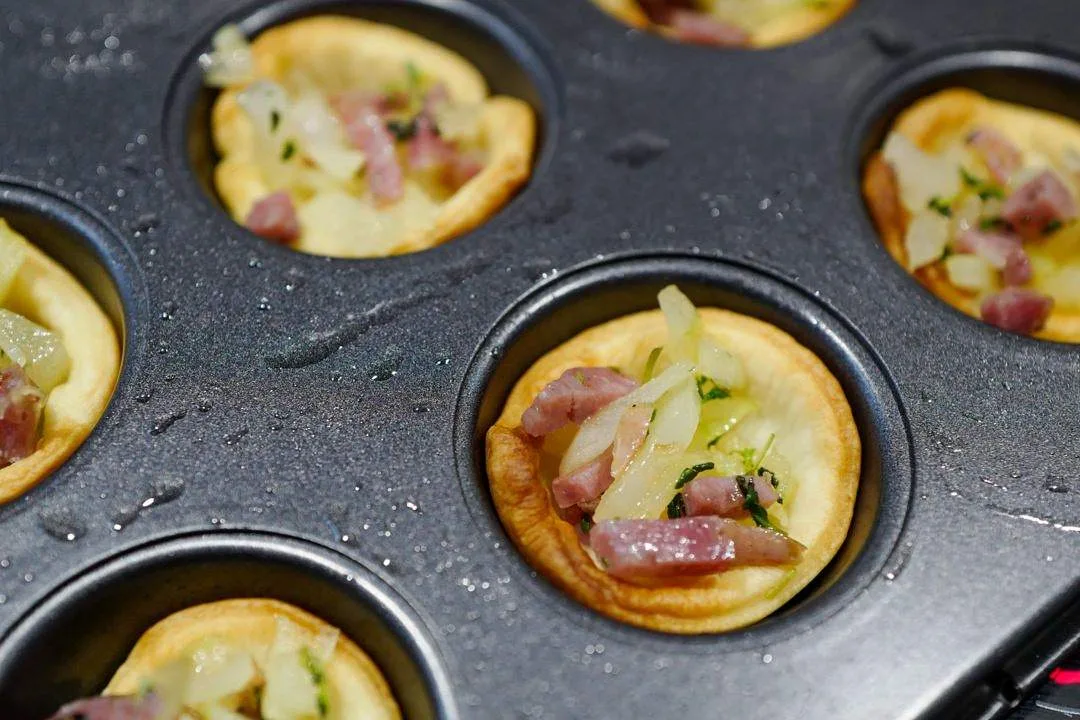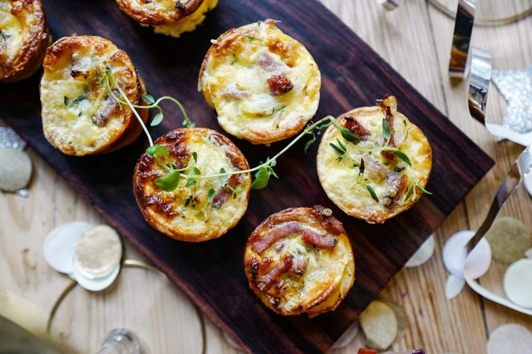 Mini-quiche med løk, timian og Passe (fennikelsalami)