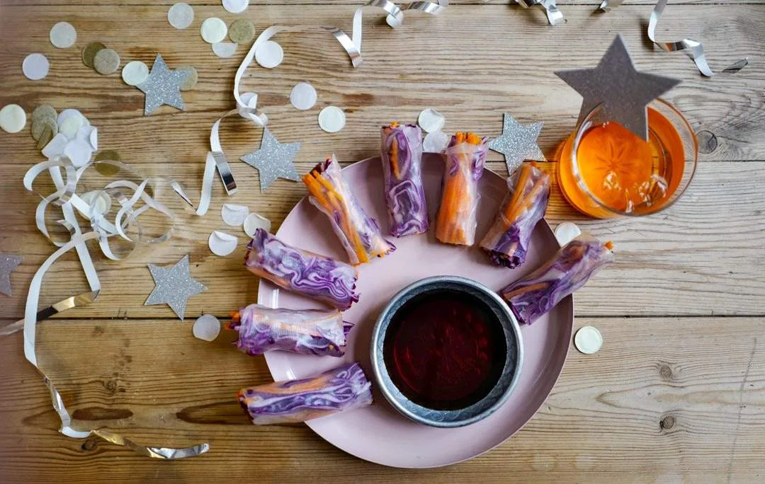 Vårruller kan være ferske med rispapir eller friterte laget med wonton. Dette bestemmer du selv. Disse er ferske og friske og er laget med rødkål, gulrot og sprøstekte staver av Slegge. Finn en god dippe-saus. Det finnes mange gode på markedet og Drit Forbanna har noen kule varianter.