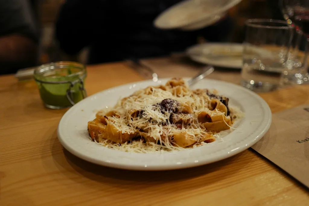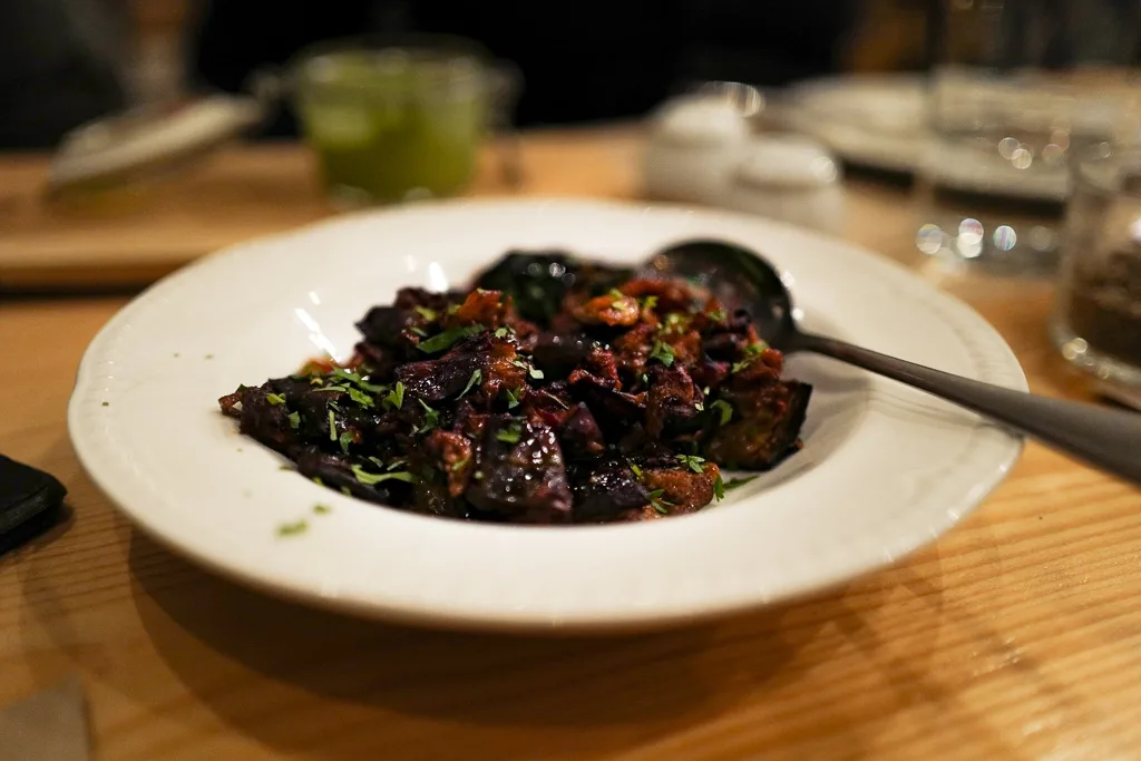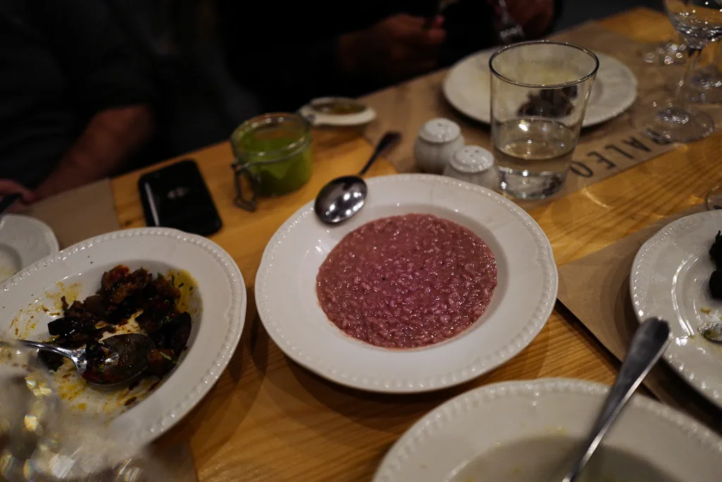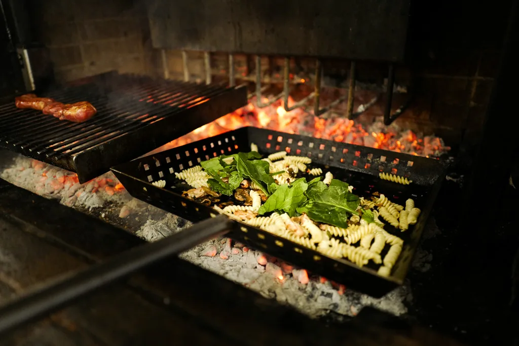 På kvelden var jeg tilbake og fikk nyte flere av de fantastiske rettene på menyen. De har stor pizzaovn som de steker paier og retter i samt en fantasisk sveivegrill á la Asador Etxebarri i Baskerland. På denne grillen griller de blant annet pasta (!) Ja, du leste korrekt.