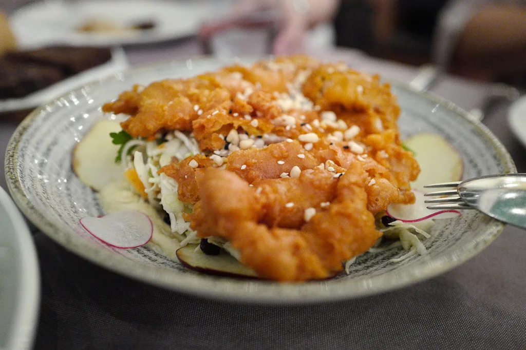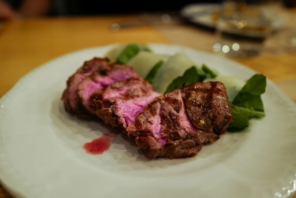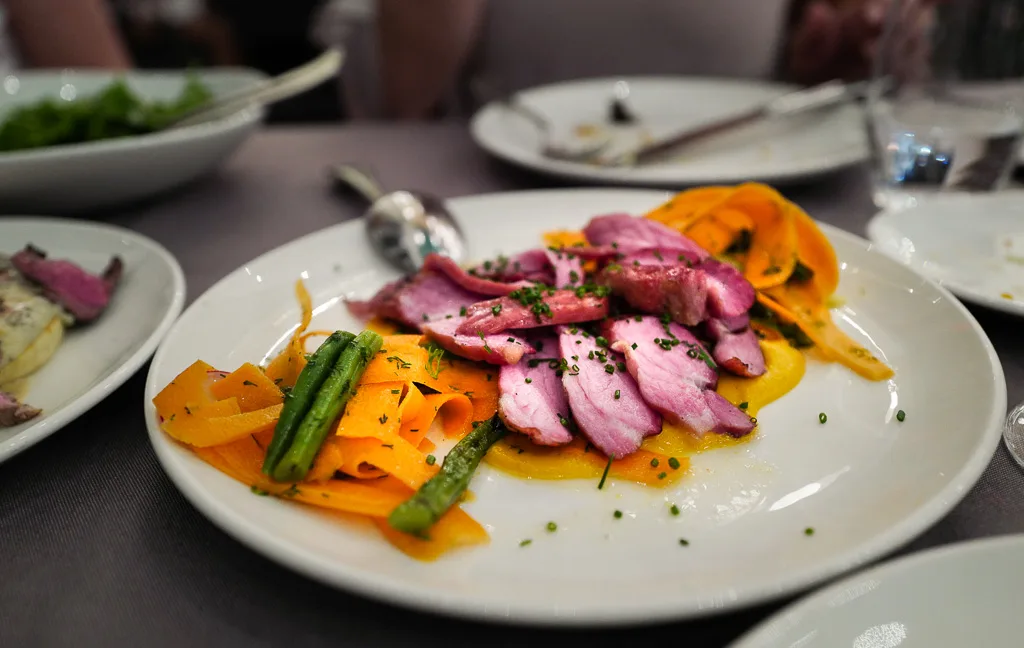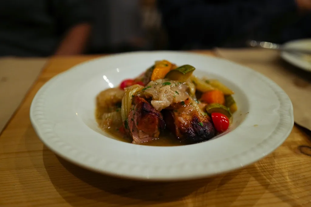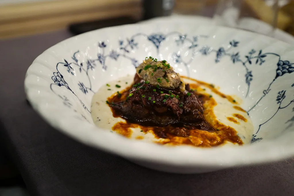 På kvelden var jeg tilbake og fikk nyte flere av de fantastiske rettene på menyen. De har stor pizzaovn som de steker paier og retter i samt en fantasisk sveivegrill á la Asador Etxebarri i Baskerland. På denne grillen griller de blant annet pasta (!) Ja, du leste korrekt.