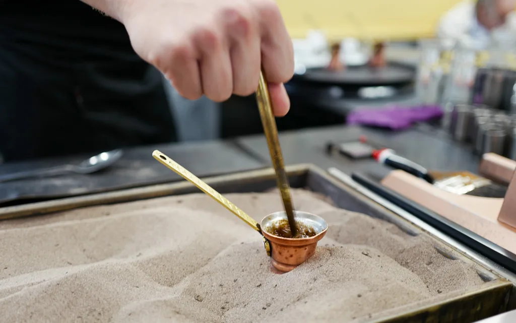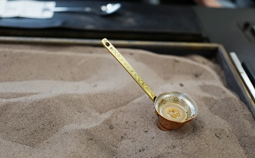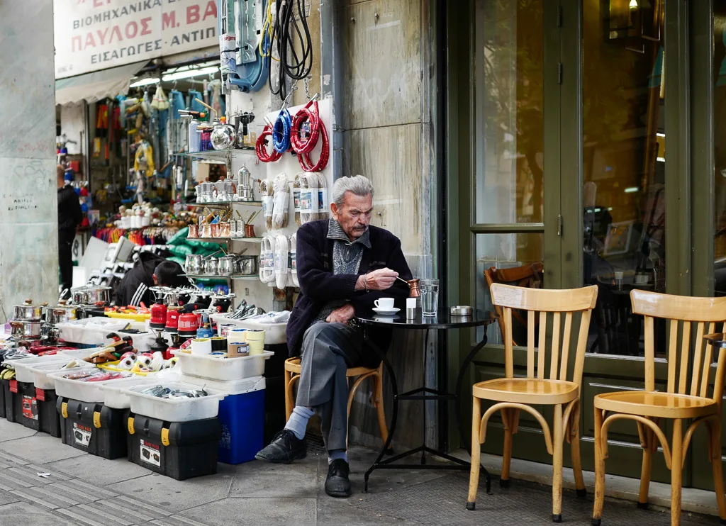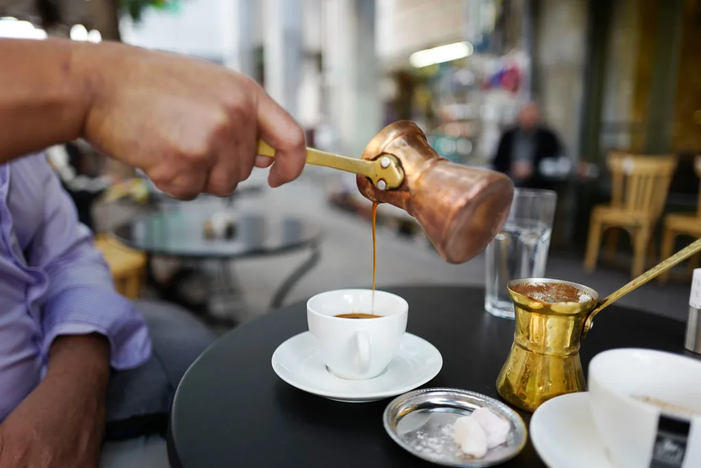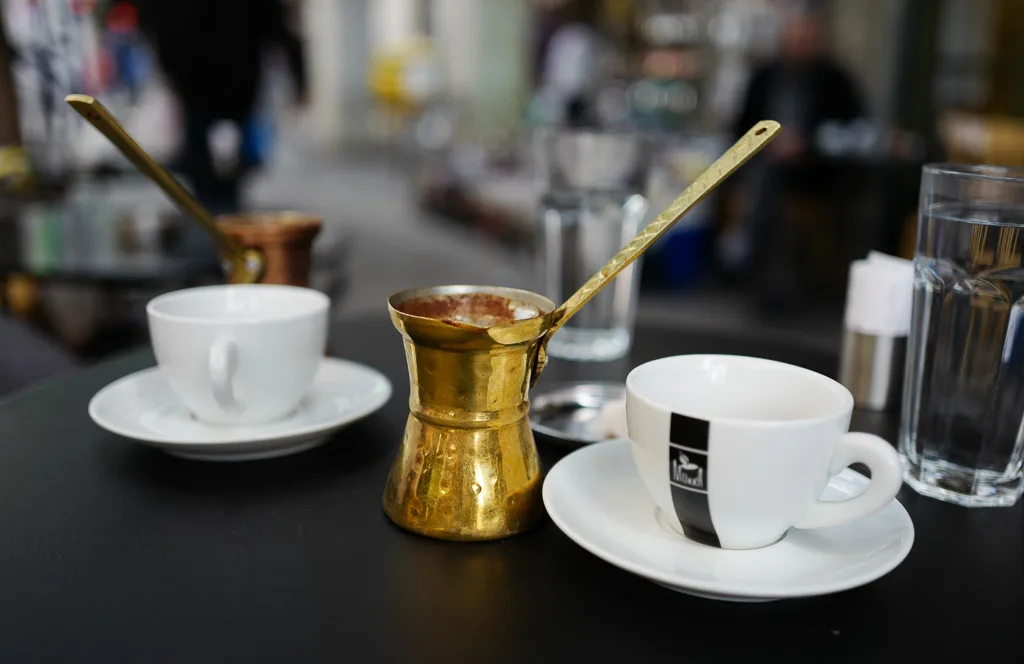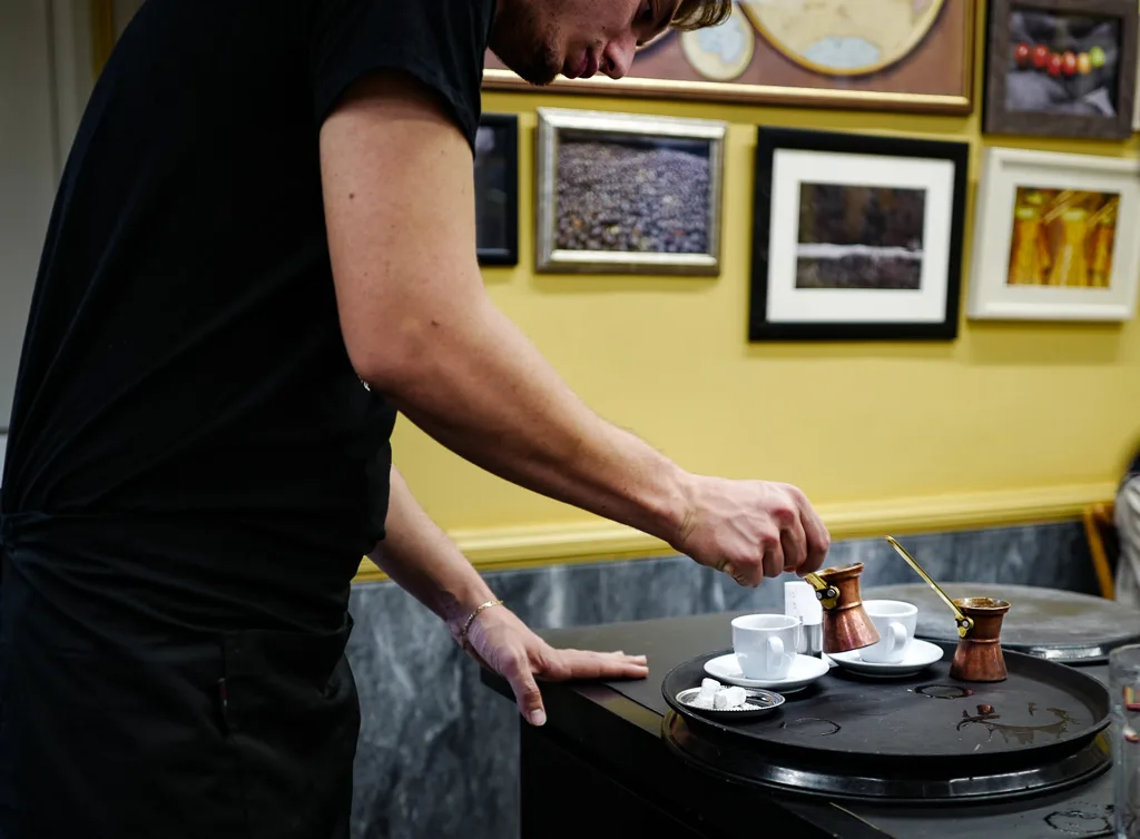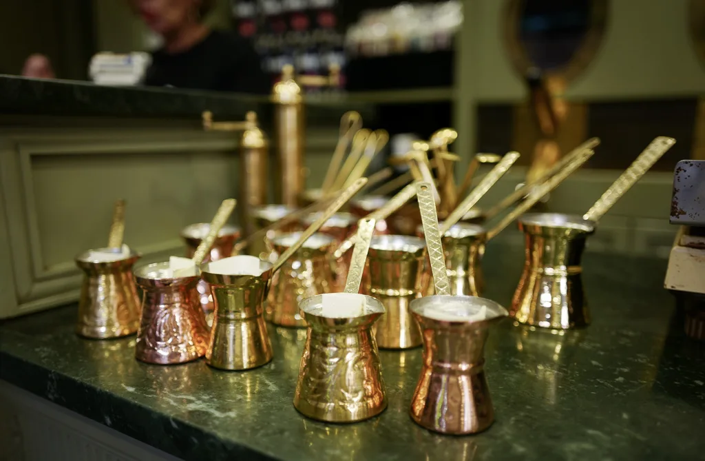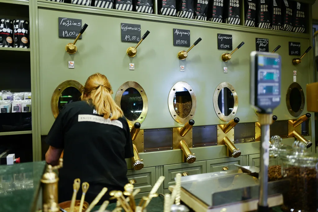 Vegg-i-vegg ligger kaféen. Her serveres klassisk gresk mokka, men også trendy Cold Brew og andre varianter.