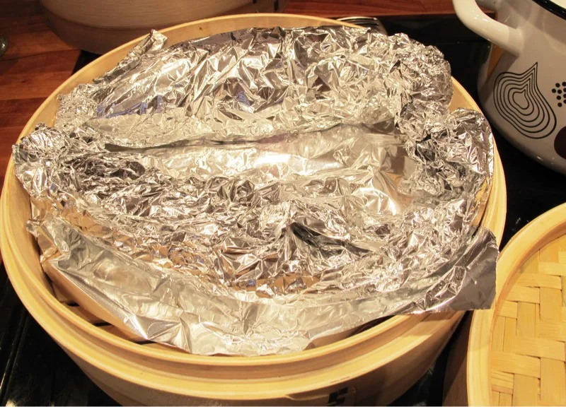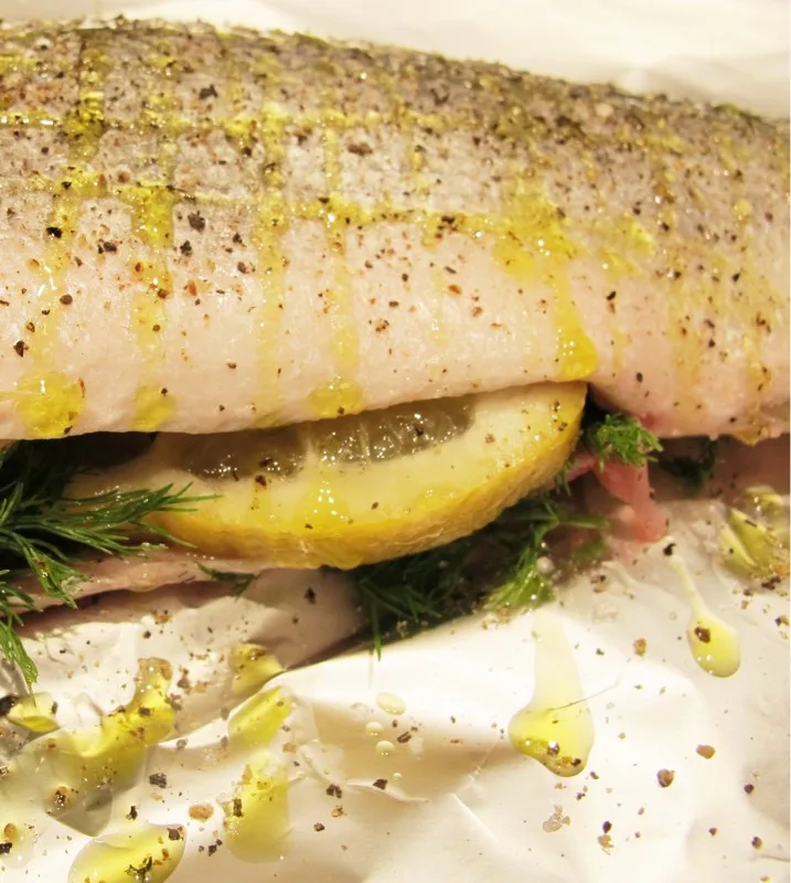 Salt og pepre. Hell over noen dråper olivenolje. Pakk sammen folien slik at ikke væske renner ut. Legg på en rist eller i en bambusdamper ( se bloggen min, saken om sunn damp) i en gryte med litt vann. Damp fisken under lokk i en hslvtimes tid. Sjekk med å føre en tynn kniv ved beinet på fisken. Du kan også bake fisken i ovnen på samme måte. Ikke noe problem.