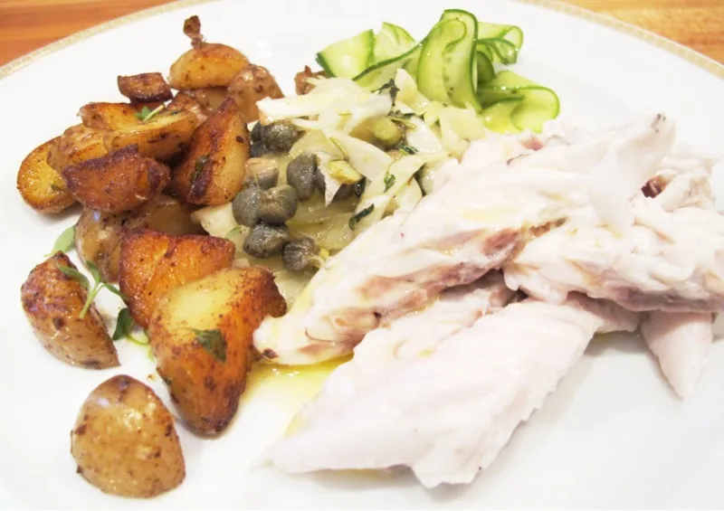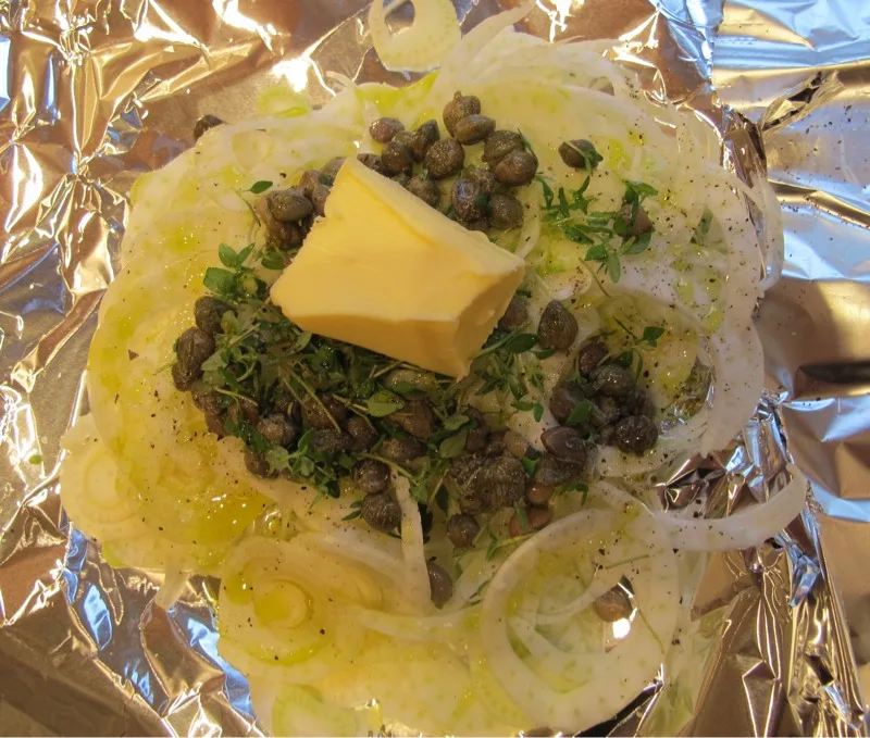 På et stykke folie legger du en neve kapers (bruk gjerne salte kapers som du kan lese om på bloggen min under tittelen salte kapers)sammen en fennikel som du skjærer så tynt du kan. Litt sitronsaft, salt, pepper og evt. litt frisk timian. Pakk sammen til en tett pakke og damp det sammen fisken. Alt blir ferdig til samme tid.