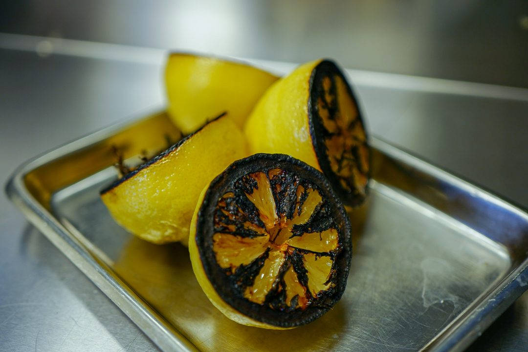 Legg kjøttsiden på sitronene på en grill eller i en varm og tørr stekepanne. Stek til flaten er mørk.