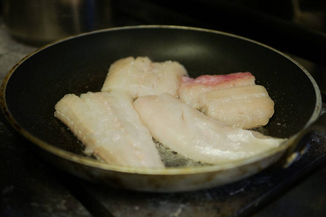 Legg fiskestykkene med skinnsiden ned. Beveg pannen slik at fiskeskinnet ikke setter seg fast. Legg smør i pannen og lett på lokk slik at fisken stekes jevnt over det hele. Sjekk med en kniv inn mot midten om fisken er ferdig. Husk: hvis fiskestykkene har ulike tykkelser trenger de forskjellig steketid. Halestykket blir først ferdig.