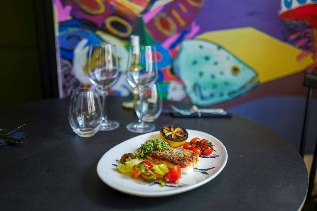 Vi startet med østers, thai style og nå er står stekt hvit fisk med chimichurri, grillet sitron og tomatsalat på menyen.