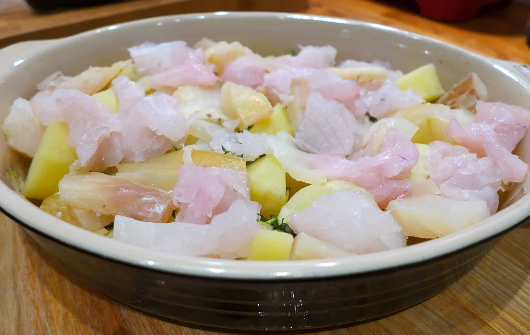 • Rens fiskestykkene og legg i en ildfast form sammen med potetbitene. Dryss over litt frisk timian.