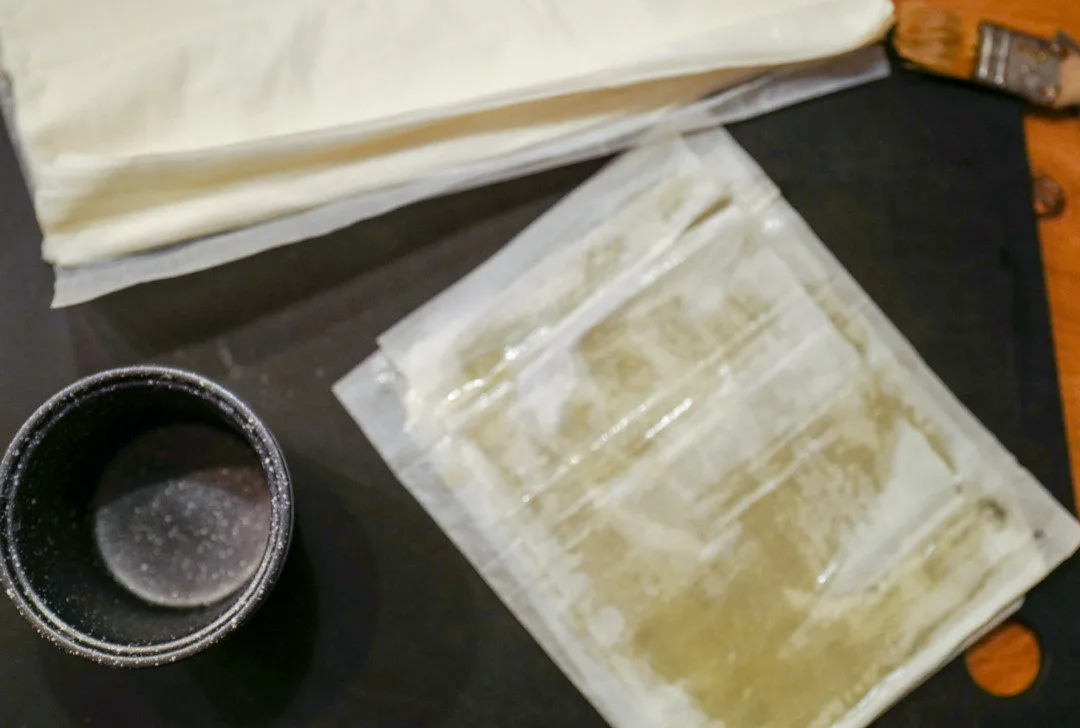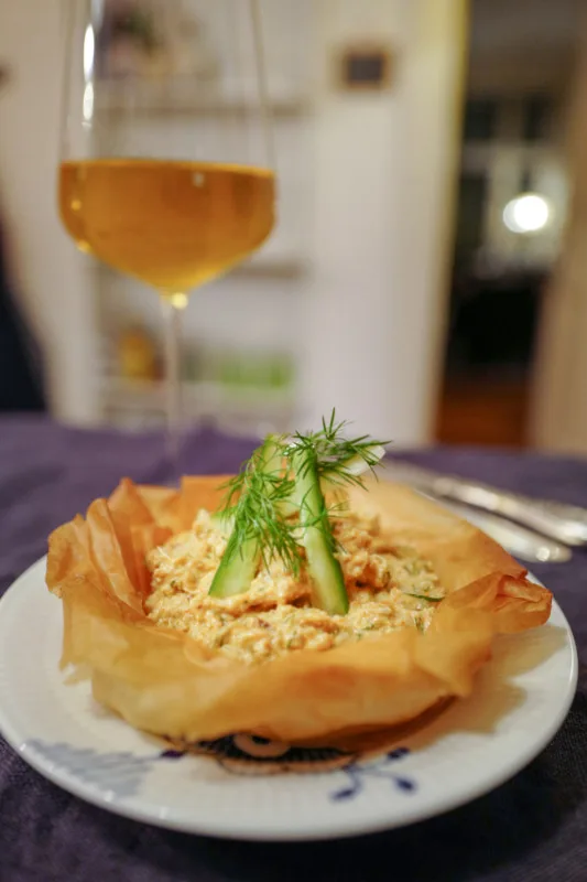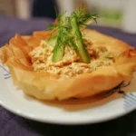 - Skjær like firkanter av filodeig og pensle med smeltet smør. Legg lagvis. Du trenger minimum fire lag for å få et solid terteskjell. Ha dette over i en form som du selv velger og stek i ovnen til terteskallet er sprøtt og gyllent. Vær forsiktig når du tar det ut av formen.