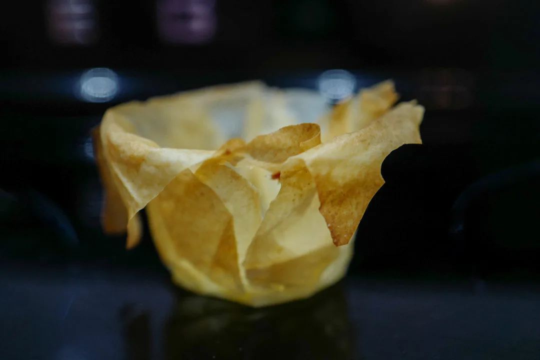Du kan bruke hva som helst av former for å lage terteskjellene. Det kommer an på hvilken form du ønsker. Når de er ferdigstekte ser de ut som brunt bakepapir som er krøllet sammen. ganske kult, altså!