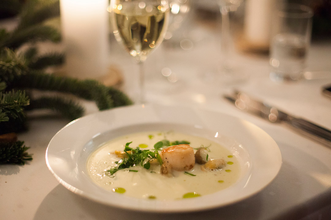 Hvis du vil lage suppen lik denThe Flying Culinary Circus lagde gjør du slik: Stek kamskjell og pynt suppen med strimlede sukkererter og urteolje.