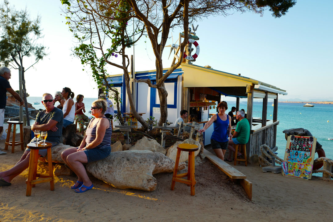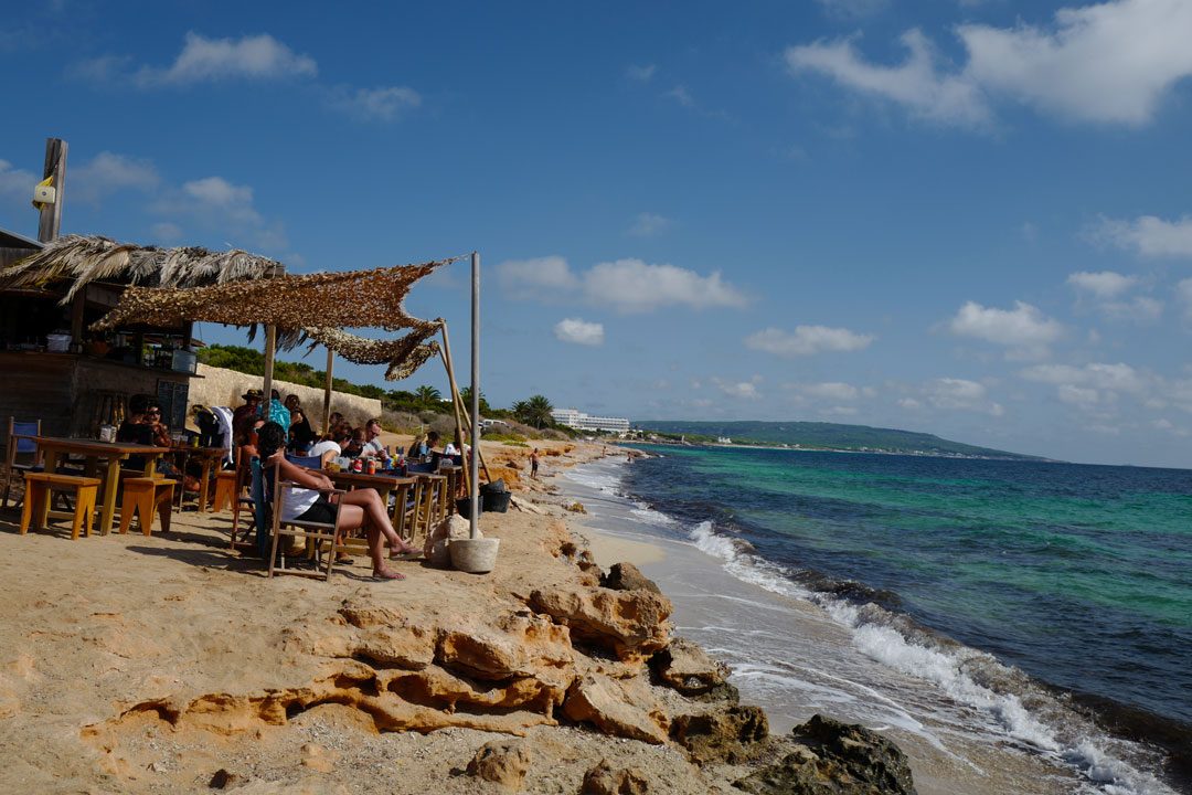 Cala Saona er en bukt med strandhotell, barer og restauranter. Stranden er veldig fin og sandkvaliteten er i verdensklasse. Baren som ligger som en liten hytte på berget er så koselig! Perfekt sted å nye en øl eller en liten hierbas – hjemmelaget urtelikør.